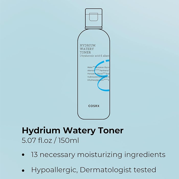 پوست کمآب، خسته و ملتهب یکی از علت های بوجود امدن پوست کدر بدون شادابی و دارای چین و چروک میباشد . تونر آبرسان واتری هیدریوم کوزارکس (COSRX Hydrium Watery Toner) یک انتخاب ایدهآل برای افرادی است که میخواهند پوستشان عمیقاً آبرسانی شود، شادابتر به نظر برسد و سد محافظتی آن تقویت گردد.تونر آبرسان هیدریوم کوزارکس یک تونر آبرسان سرشار از ویتامین B5 و اسید هیالورونیک است؛ از این تونر میتوان بعنوان اسپری آبرسان استفاده کرد به این دلیل که پوست را هیدراته و شاداب و شفاف نشان میدهد . وجود مقادیر زیادی ویتامین B5 که به عنوان پانتنول شناخته شده است ،یک عنصر کلیدی که سبب شده تا تونر دارای اثرات مرطوب کننده، بازسازی کننده و ضد التهابی باشد و استفاده از آن برای پوست های مستعد آکنه نیز توصیه شود. تونر COSRX صرفا حاوی مواد مرطوب کننده لازم با 13 ماده مفید دیگر است. این محصول قدرت رطوبت رسانی بالای خود را از کمپلکس Hydrium Synergy-8 که از شش نوع اسید هیالورونیک، دی پانتنول و آلانتوئین تشکیل شده است، بهره میگیرد. مجموعه ای از این ترکیبات آبرسان و مرطوب کننده، پوست را با رطوبت پر می کنند و آن را تا مدت طولانی هیدراته نگه میدارند.